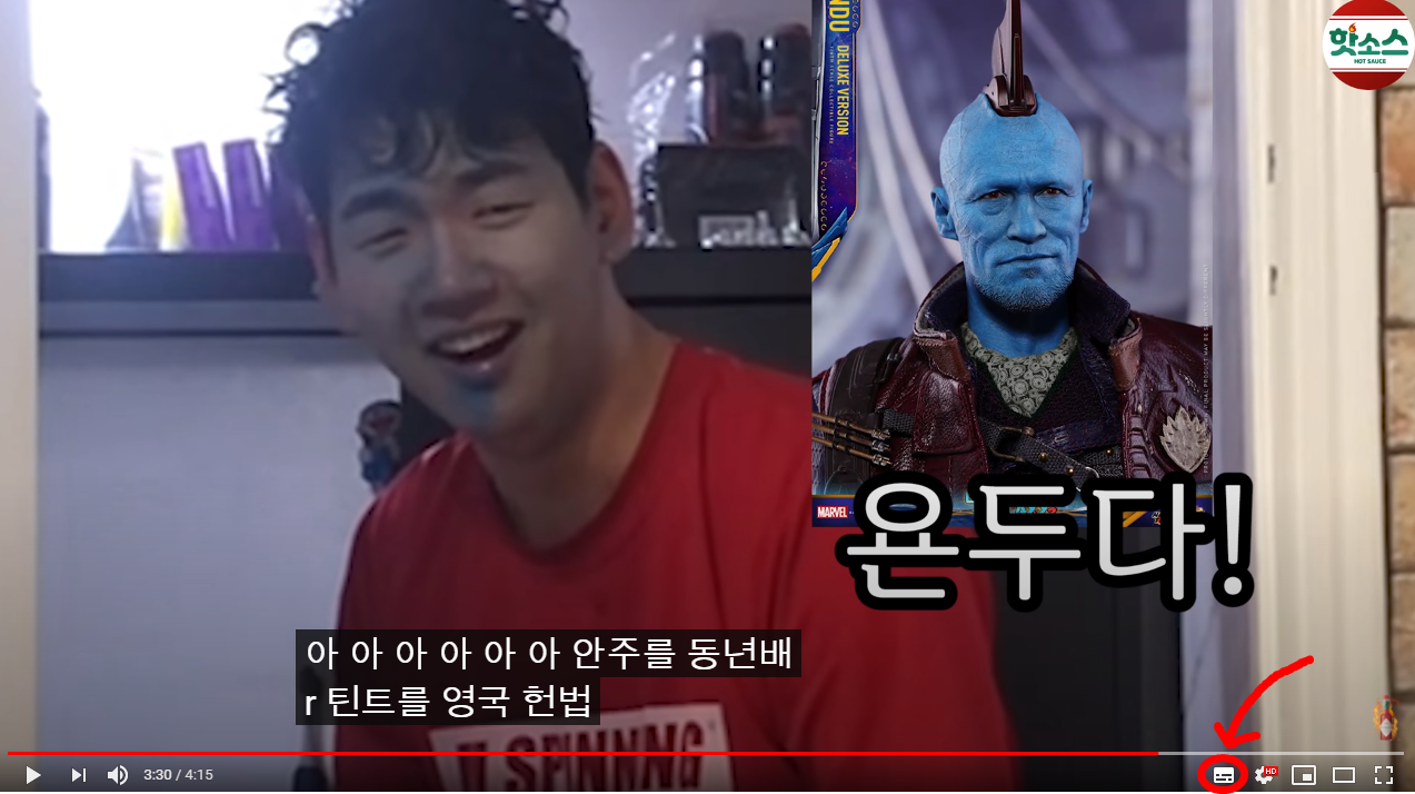 톱니바퀴 왼쪽에 보면 키보드처럼 생긴게 있는데 이거 누르면 바로 자막을 보여준다.